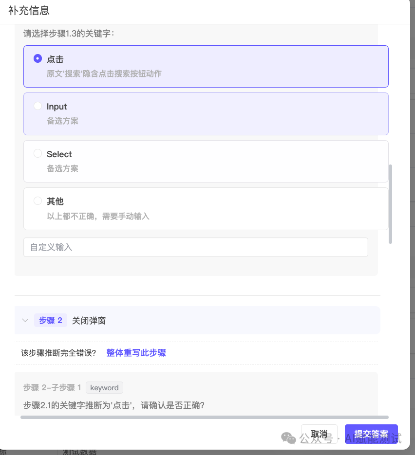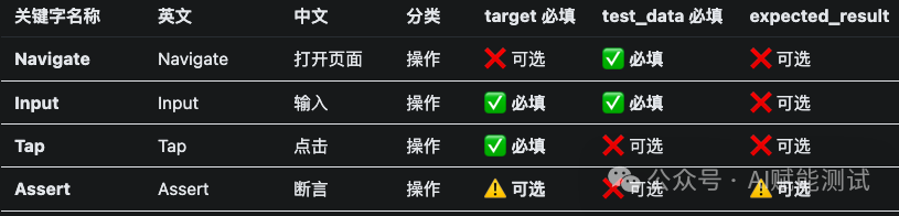 但如果这里只做严格字符串匹配,又会带来另一个问题:自然语言本来就不是按关键字表写出来的。测试人员可能写“填写用户名”,系统关键字却叫<code>输入</code>;可能写“验证结果”,系统内部却对应<code>断言</code>;还可能写“跳转到报表页”,而平台动作名是<code>打开页面</code>。如果把这些都判成“不在原文中”,系统虽然看起来更严,实际却是在错杀有效信息。