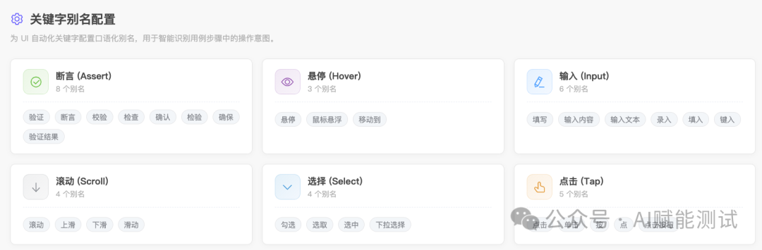 所以我们在<code>extracted</code>校验里加入了别名映射机制。系统维护一张可持续扩展的同义表达表,把“填写/录入/输入”“验证/校验/断言”“跳转/进入/打开页面”这类自然表达映射到统一动作语义。只要原文命中这些别名,系统仍把它视为来自原文的有效信息,保留<code>extracted</code>这一最高可信来源。更重要的是,这张映射表不是硬编码在系统里的黑盒规则,而是可以持续维护的配置能力,后续能够按业务习惯逐步扩展。它不是放宽标准,而是在不牺牲严谨性的前提下,承认真实用户语言的多样性。