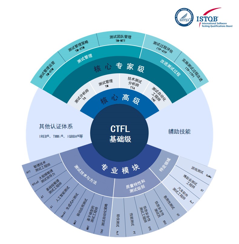 ISTQB®Certified Tester 认证以圈层式结构,覆盖不同程度软件测试人员需求,考生获得基础级证书后,可申请参加相应更高级别的培训和认证考试。